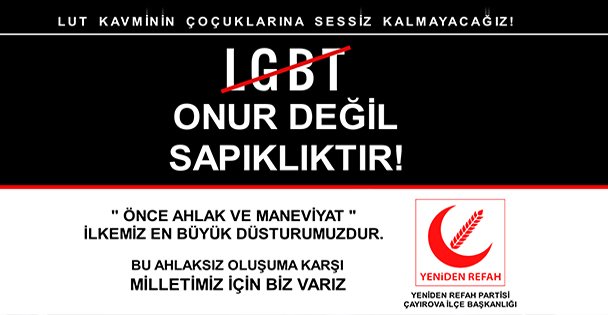 Yeniden Refah Partisi Çayırova İlçe Başkanlığı “LGBT; Onur Değil, Ahlaksızlıktır, Geleceğimiz İçin, Nesillerimiz İçin, Ahlaksızlığa DUR DE!” sloganıyla bu akşam yürüyüş gerçekleştirecek. Yürüyüş