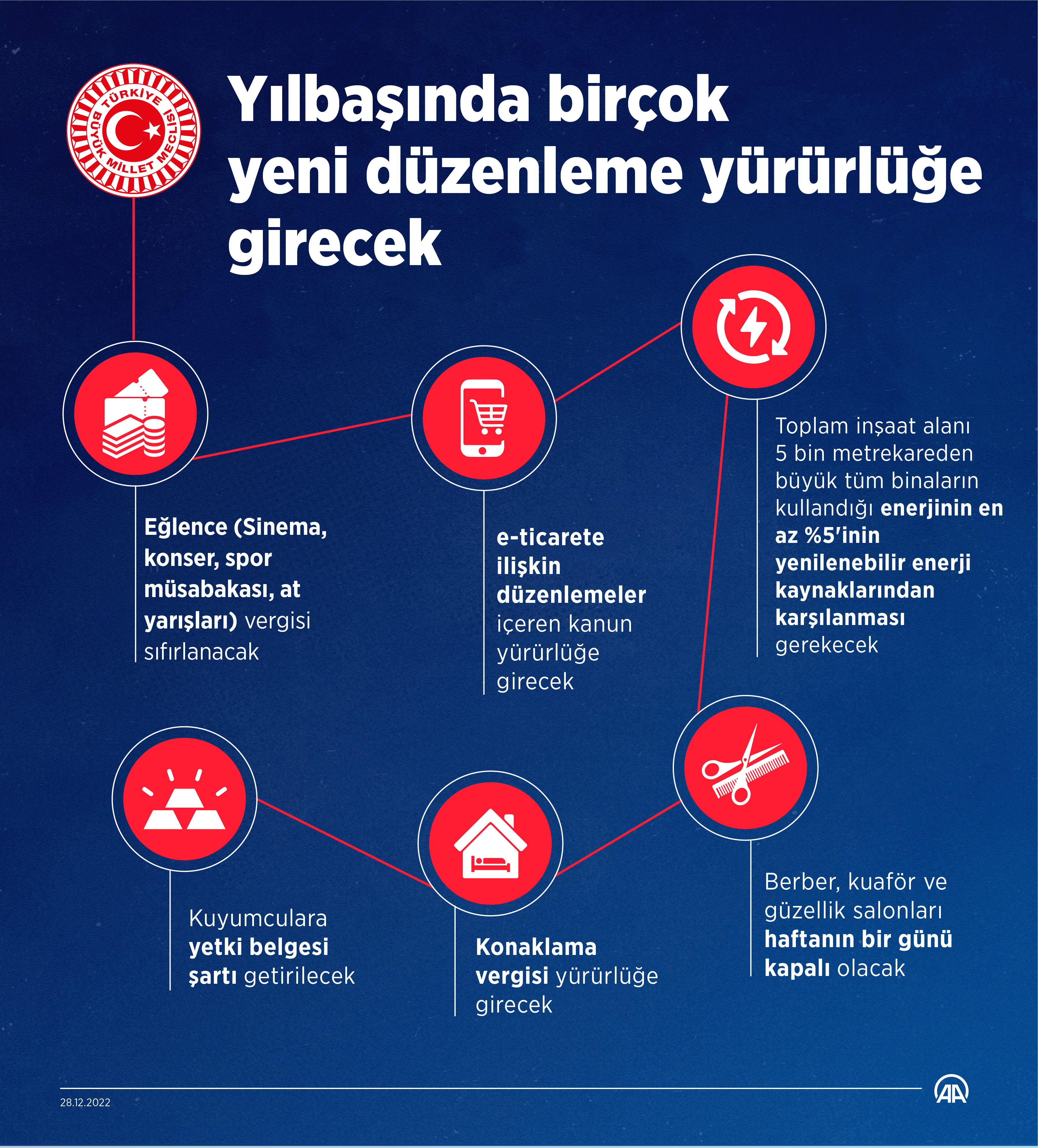 Yılbaşında birçok yeni düzenleme yürürlüğe girecekYılbaşından itibaren vatandaşı, esnafı ve reel sektörü ilgilendiren birçok düzenleme yürürlüğe konulacak. 28 Aralık 2022 Çarşamba 15:58 Facebook'ta Paylaş Tweetle Google+ Paylaş
