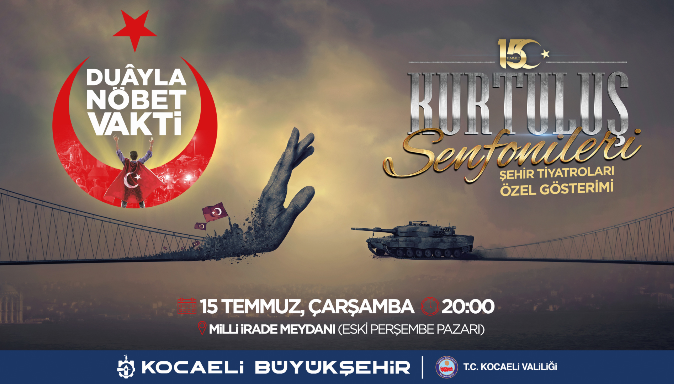 Kocaeli Büyükşehir Belediyesi Şehir Tiyatroları, bu yıl duayla nöbet vakti gecesinde ‘’Kurutuluş Senfonileri 15 Temmuz’’ özel gösterimini sahneleyecek. Türk milletinin 15 Temmuz 2016’da yazdığı destanla başlayan; Anadolu türküleri ve evrensel armonilerle harmanlanan Kurtuluş Senfonileri, 15 Temmuz’un 4. yılında Kocaeli halkıyla buluşacak. Milletimizin canıyla, kanıyla, ortak iradesiyle yazdığı mücadele ve kurtuluş destanı; 251 şehidimiz, binlerce gazimiz ve Ömer Halisdemir’in kimliğinde toplanan ölümsüz kahramanlarımız saygı ve minnetle anılacak.