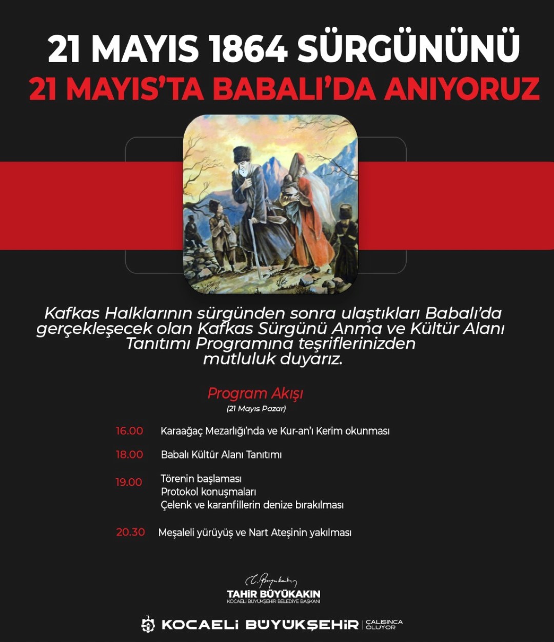 Kocaeli Büyükşehir Belediyesi, 1864 yılında Karadeniz kıyılarından Osmanlı topraklarına göçe zorlanan Abaza, Adige, Çerkes, Ubıh ve diğer Kafkas Halklarının yaşadıkları acının unutulmaması amacıyla 21 Mayıs Pazar günü Babalı Kültür Alanı tanıtım ve anma töreni düzenleyecek. Kandıra Babalı’da gerçekleşecek programda Çerkes vatandaşlar, Çarlık Rusya’sı tarafından sürgünde ölen atalarını yad edecek. Aynı zamanda Kocaeli Büyükşehir Belediye Başkanı Tahir Büyükakın’ın daha önce açıklamış olduğu Kafkas Sürgünü Kültür Alanı projesi de hayata geçecek.