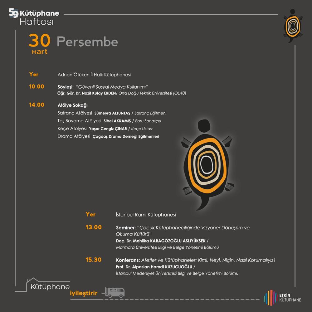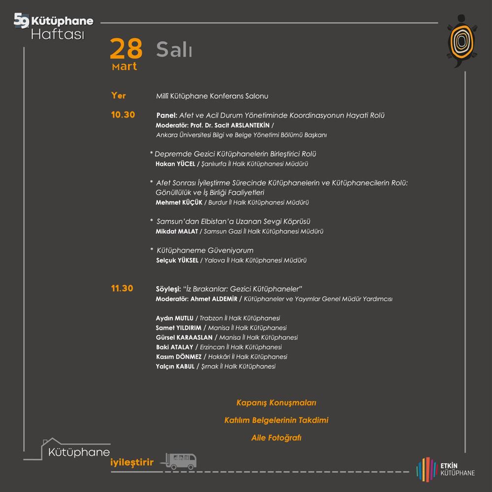 Haftanın ikinci günü “Afet ve Acil Durum Yönetiminde Koordinasyonun Hayati Rolü” ile “İz Bırakanlar: Gezici Kütüphaneler” adlı oturumlarda deprem bölgesinde görev yapmış kütüphane müdürleri ve personeller yaşanılanları paylaşacak.