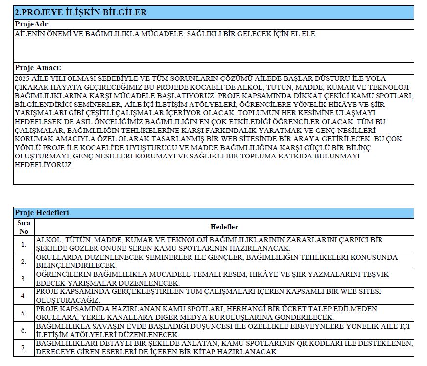 Proje ile Kocaeli’de ve Türkiye genelinde gençlerin bağımlılık riskine karşı daha bilinçli hale gelmesi ve toplumda güçlü bir farkındalık oluşturulması hedefleniyor.