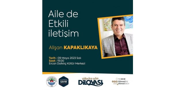 Dilovası Belediyesi kültür Müdürlüğü tarafından organize edilen eğitim seminerlerinin bu ayki konuğu Eğitimci-Yazar Alişan Kapaklıkaya olacak. Kapaklıkaya, 9 Mayıs Salı (bu akşam) Dilovası Ercan Dalkılıç Kültür Merkezi’nde saat 19:00’da düzenlenecek seminer ile Dilovalılara “Aile İçi İletişim” konulu konferans verecek.