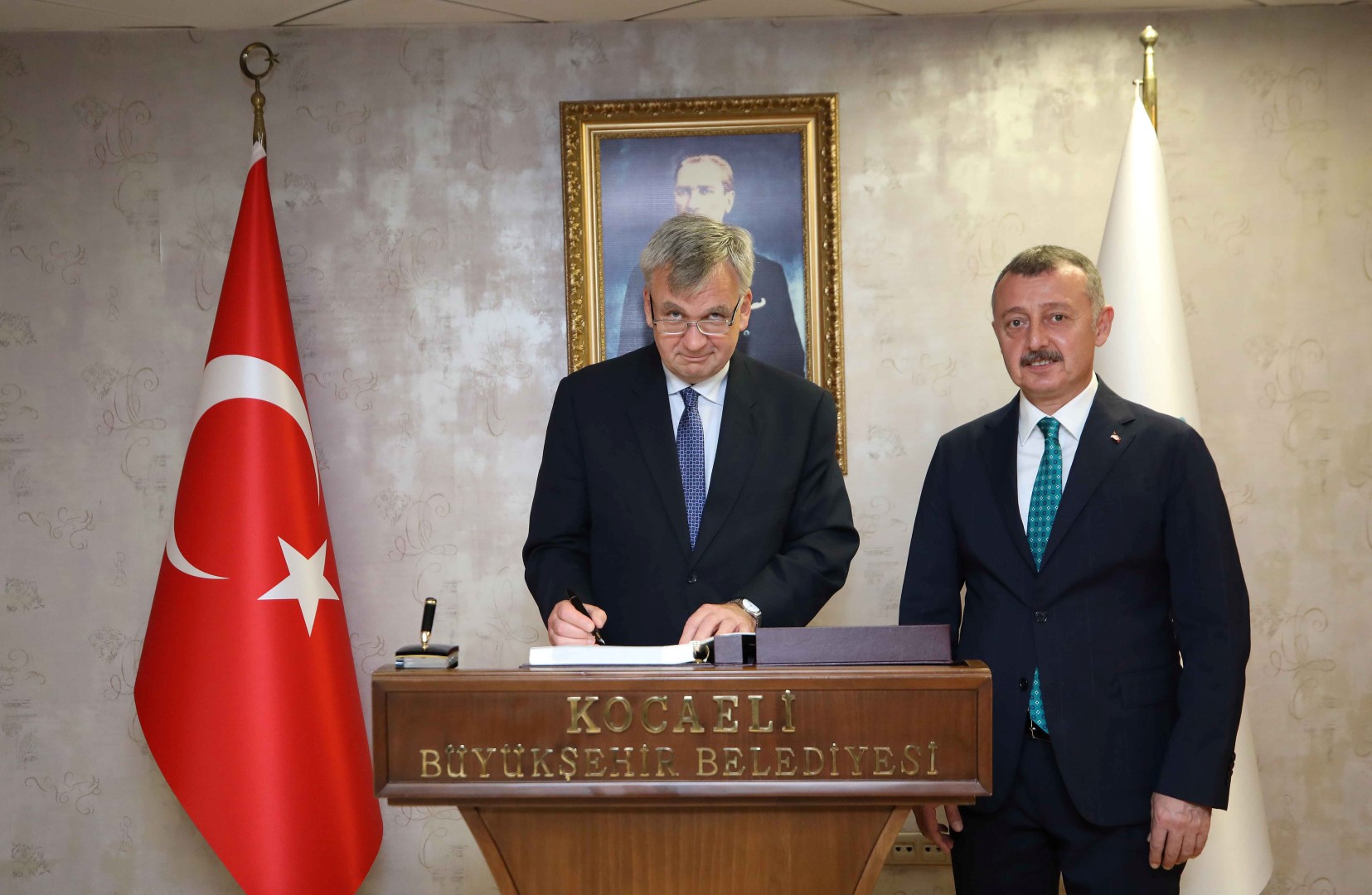 Türk Alman Yatırım ve İş Birliği Günü programı nedeniyle Kocaeli’ne gelen Almanya Federal Cumhuriyeti Büyükelçisi Jürgen Schulz, Marmara Belediyeler Birliği ve Kocaeli Büyükşehir Belediye Başkanı Doç. Dr. Tahir Büyükakın’a nezaket ziyareti gerçekleştirdi. Görüşmede Kocaeli’deki yatırım fırsatlarından nitelikli insan kaynağındaki büyük potansiyele, uluslararası gelişmelerden çevre başlıklarını içeren konulara görüş alışverişinde bulunuldu. Marmara Denizi’nde yaşanan müsilaj başta olmak üzere İzmit Körfezi’nde ortaya konacak çevre projeleri hakkında da konuk Büyükelçiyle konuşan Başkan Büyükakın, Kocaeli’nin gelişim sürecinden doğal güzelliklerine de değindi. Kocaeli Büyükşehir Belediyesi Dış İlişkiler Daire Başkanı Sabahattin Yamak’ın da hazır bulunduğu görüşmede Başkan Büyükakın, konuk büyükelçiyle Ukrayna-Rusya savaşı üzerine değerlendirmelerde bulundu. Ziyarette Kocaeli’nin Almanya’daki şehirlerle yapabileceği işbirlikleri de ayrıca ele alındı.