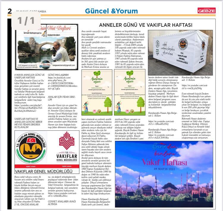Bana vakıf ruhunu veren ilk hocam ana vekilim vakıf İnsanı rahmetli Fadime halam ve köyde birlikte birçok meyve fidanı diktiğimiz rahmetli Emine anamın şahsında tüm ana ve halaları saygı minnet şükran ve ebediyete göçenleri rahmetle anıyorum ruhları için bir Fatih’e üç ihlas okuyalım El Fatiha