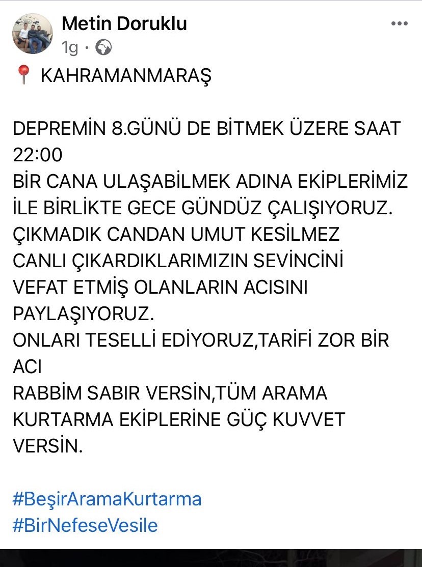 Kocaeli'nin Gölcük ilçesinde ikamet eden Metin Doruklu, yardım çalışmaları için iki büyük depremin merkez üssü Kahramanmaraş'a gitti. Doruklu, Kahramanmaraş'ta arama kurtarma çalışmaları esnasında geçirdiği kalp krizi sonucu yaşamını yitirdi. Doruklu, vefatından 1 gün önce yaptığı paylaşımında, "Depremin 8. günü de bitmek üzere saat 22.00. Bir cana ulaşabilmek adına ekiplerimiz ile birlikte gece gündüz çalışıyoruz. Çıkmadık candan umut kesilmez, canlı çıkardıklarımızın sevincini, vefat etmiş olanların acısını paylaşıyoruz. Onları teselli ediyoruz, tarifi zor bir acı. Rabbim sabır versin, tüm arama kurtarma ekiplerine güç kuvvet versin" ifadelerini kullanmıştı.