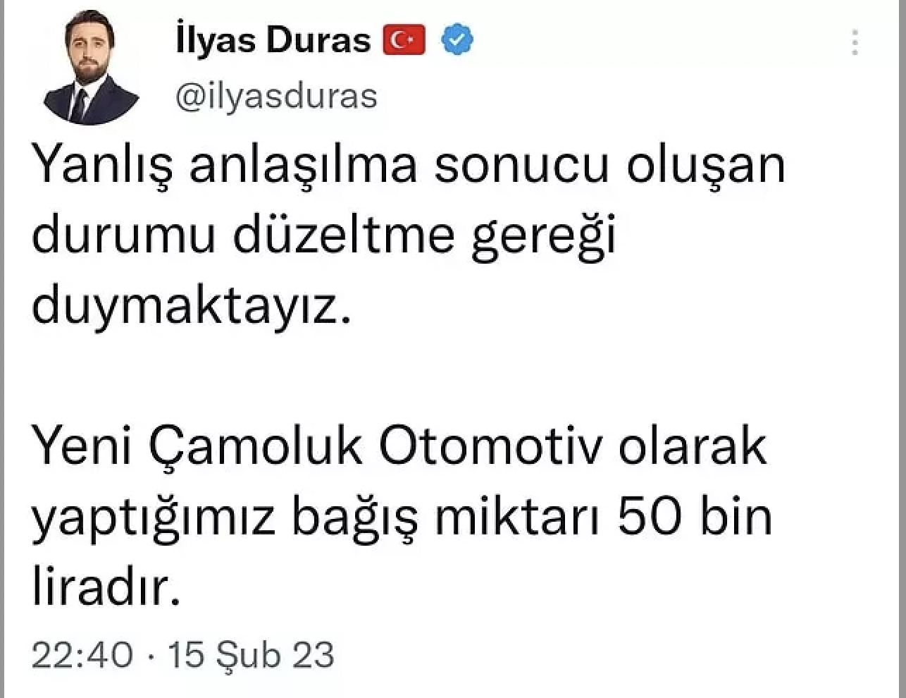 Deprem bölgesine yardım için gerçekleştirilen 'Türkiye Tek Yürek' ortak yayınında Yeni Çamoluk Otomotiv sahibi Hamit Duras'ın bağışı sosyal medyada gündem oldu. Programda bağış toplayan isimlerden ilahiyatçı Prof. Dr. Mustafa Karataş, komşusu Duras'ın 50 milyar bağış yaptığını söyledi. Sıfırlar atılmadan önceki paraya göre yanlışlıkla 50 milyar lirayı telaffuz ettiğini söyleyen Duras, aslında 50 bin TL demek istediğini belirtti. Duras, yanlış anlaşılma yaşandığını ifade ederek yaşananları anlattı.