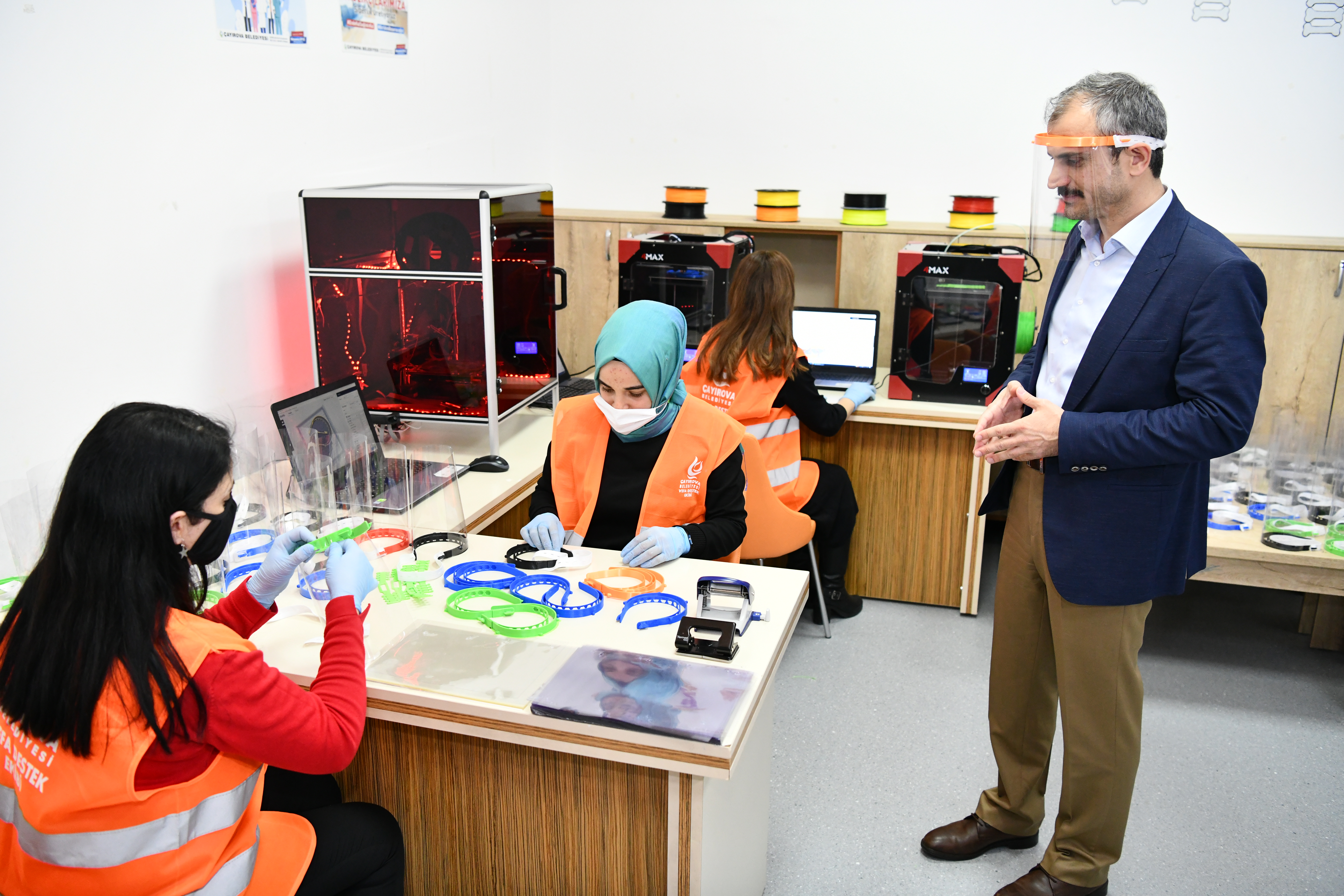 Çayırova Belediyesi, başta ilçedeki aile sağlığı merkezleri olmak üre Darıca Farabi Eğitim Araştırma ve Gebze Fatih Devlet Hastanesi’nde görev yapan hekim ve sağlıkçılara siperli maske üretiyor. Bir süredir 3-D yazıcılarla devam eden siperli maskelerin üretildiği birimde inceleme yapan ve çalışmalar hakkında bilgiler alan Çayırova Belediye Başkanı Bünyamin Çiftçi, ”Belediye olarak salgın virüsle etkin bir şekilde mücadele ederken koordine halinde çalıştığımız kurumlarımıza da gerek maske gerekse dezenfektan ve kolonya veriyoruz. Virüsle adeta savaşan sağlık çalışanlarımıza 3-D yazıcılarla siperli maske üretiyoruz. Sağlığımız için gecesini gündüzüne katarak çanla başla çalışan sağlık çalışanlarımızın için bugüne kadar ürettiğimiz siperli maskeleri ilçemizdeki aile sağlığı merkezleri başta olmak üzeri bölgemizdeki hastanede görev yapan hekim ve sağlık çalışanlarımıza vefa destek ekiplerimizle dağıtıyoruz. Onlar bizim için çalışırken biz de onlar için siperlik üretiyoruz, üretmeye de devam ereceğiz. Başta Sağlık Bakanımız olmak üzere tüm sağlıkçılarımıza fedakar çalışmalarından dolayı şükranlarımı sunuyorum. Onlar için ne yapsak azdır.” dedi.