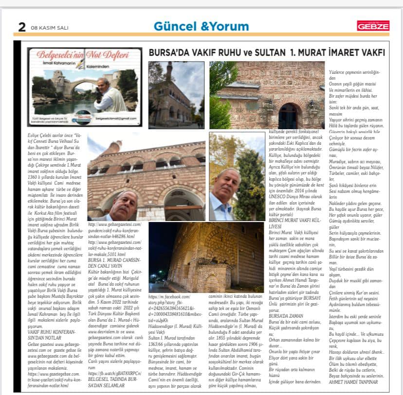 Kültür bakanlığının bizi Çekirge’de misafir ettiği Marigold otel Bursa’da vakıf ruhunun yaşatıldığı 1. Murat külliyesine çok yakın olmasına çok sevindim. 5 Kasım 2022 tarihinde sabah namazı vakti 2022 yılı Türk Dünyası Kültür Başkenti olan Bursa’da 1. Murad-ı Hüdavendigar camisine giderek www.devrialem.tv ve www.gebzegazetesi.com olarak canlı yayında Bursa tarihine not düşüp zamana noterlik yapmayı bir görev kabul ettim.