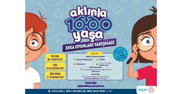 Ödüllü zekâ oyunları yarışması için kayıtlar 28 Mart tarihinde son bulacak. Kent genelinde hizmet veren resmi ve özel kurum dördüncü sınıf öğrencileri http://aklinla1000yasa.kocaeli.bel.tr üzerinden başvurularını gerçekleştirebilecek. Yarışma sorularının hazırlanması ve değerlendirilmesi Türkiye Zekâ Vakfı tarafından, Türkiye Zekâ Oyunları Yarışması standartlarına göre yapılacak. Ayrıntılı bilgi yönerge kitapçığında katılımcılarla paylaşılacak.