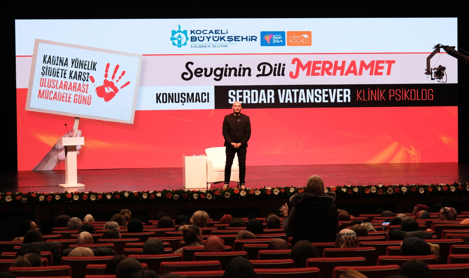 Programda klinik psikolog Serdar Vatansever de , “Sevginin Dili Merhamet” adlı bir seminer verdi. Katılımcılara öz şefkatin önemini anlatan Vatansever, “Kendine merhametli olan başkasının merhametsizliğine katlanmaz. Biz şiddetin ne olduğuna bakıp onu ayırt etmeye çalışacağımıza, bundan bizi korumayacak iç dünyaya şefkat göstermeye çalışıyoruz. Manipülasyon da bir şiddet türüdür. Kendimize vereceğimiz öz şefkat kısmında duygusal anlamda kendimizi manipüle ediyoruz. Hata yaptığınız zaman kendinizle ilişkinizi düzeltmeniz için önce iç sesinizle aranızı düzeltmeniz lazım” şeklinde konuştu. Seminerin sonunda Berna Abiş tarafından klinik psikolog Serdar Vatansever’e çiçek takdim edildi.