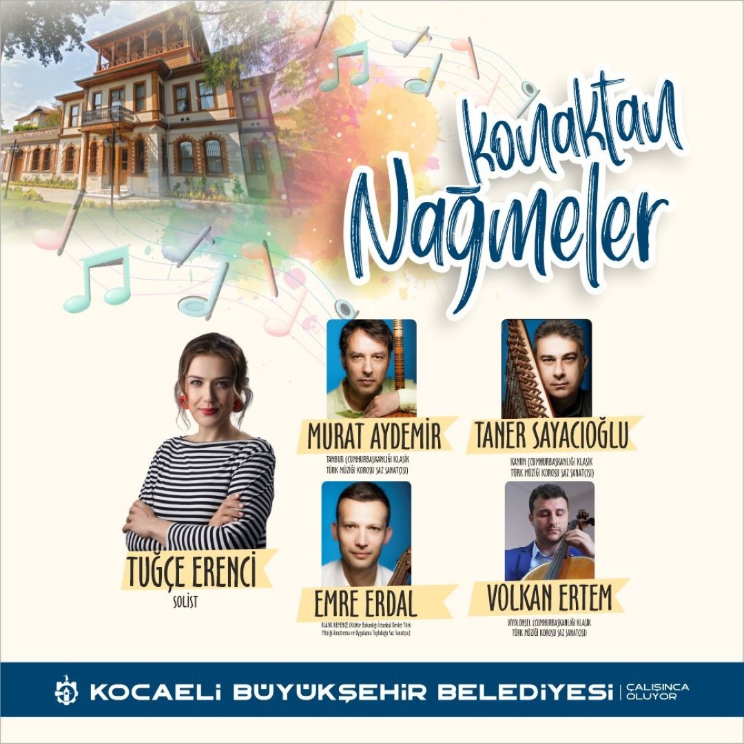 Kocaeli Büyükşehir Belediyesi, 14 Eylül Çarşamba akşamı uzun yıllar gönüllerden çıkmayacak bir Türk Sanat Müziği konseri düzenleyecek. Türk Sanat Müziği’nin eşsiz tınıları, kentin en kıymetli tarih mekânlarından biri olan Selim Sırrı Paşa Konağı’ndan yükselecek. ‘Konaktan Nağmeler” adını taşıyan konser, 20.00’de başlayacak. Konuklar konseri, Selim Sırrı Paşa Konağı’nın bahçesinde dinleyecek.