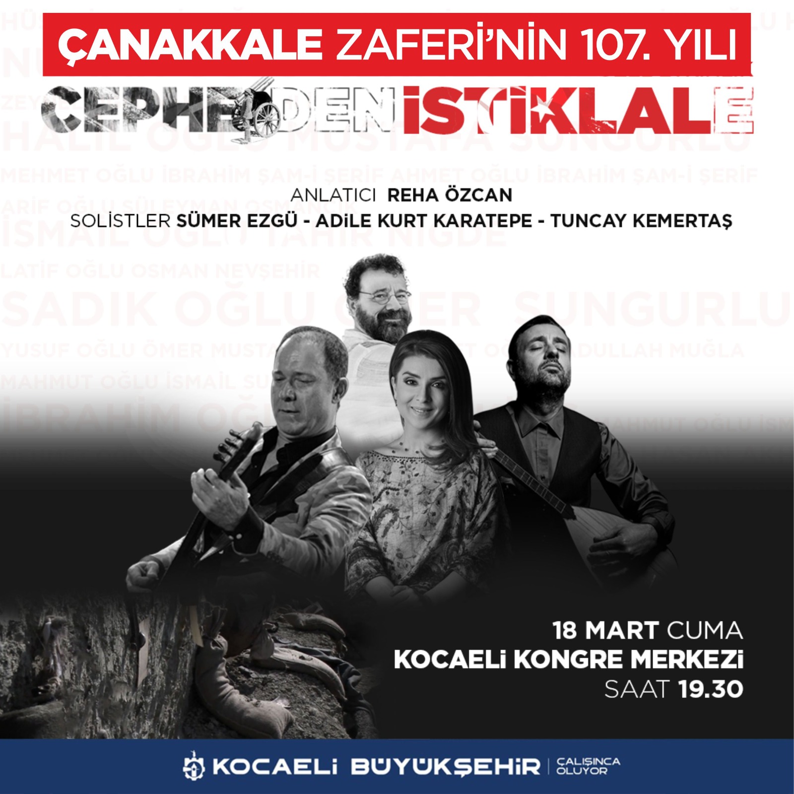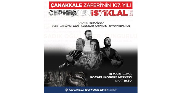Zafer coşkusuna anlam katacak etkinlik saygı duruşu ve İstiklal Marşı’nın okunmasıyla başlayacak. Açılış konuşmalarının ardından tiyatro sanatçısı Reha Özcan’ın Çanakkale Destanı anlatımıyla sahne etkinliği gerçekleştirilecek. Programda ayrıca sanatçılar Adile Kurt Karatepe, Sümer Ezgü ve Tuncay Kemertaş gönüllere taht kurmuş Çanakkale türkülerini seslendirecek.