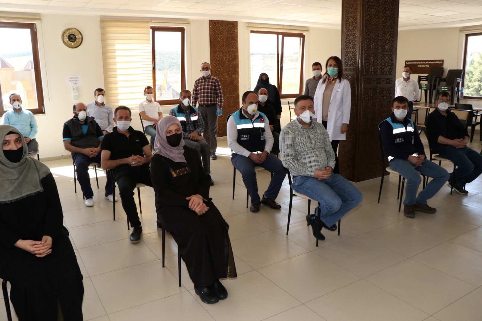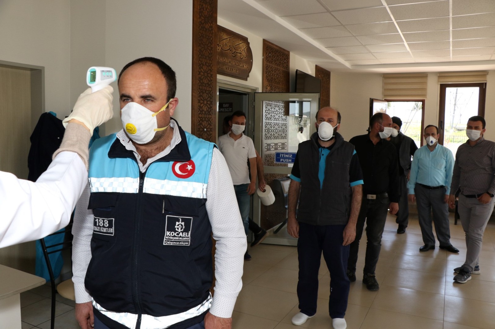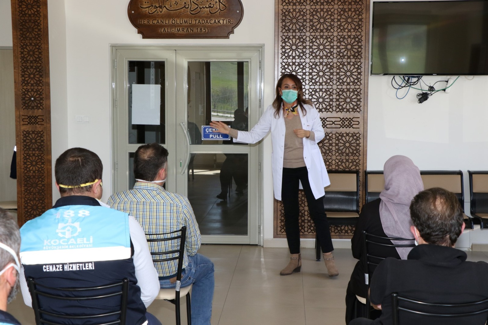 Kocaeli Büyükşehir Belediyesi Kent Mezarlığı Hizmet Binası’nda gerçekleşen eğitimde, cenaze hizmetleri personellerine Covid-19 tanısı ile vefat eden kişilere uygulanacak prosedür anlatıldı. Eğitimde personellerin eldiven, maske (N95/FFP2), gözlük/yüz koruyucu ve sıvı geçirmez önlük kullanmaları belirtildi. Cenaze yıkama alanlarının 1/10 oranında çamaşır suyu veya klor tablet ile dezenfekte edilmesinin gerekliliği aktarıldı. Ayrıca personellere el hijyeni, standart enfeksiyondan korunma ve kontrol önlemleri ile solunum sekrasyonları ve temas önlemleri konularında eğitim verildi.