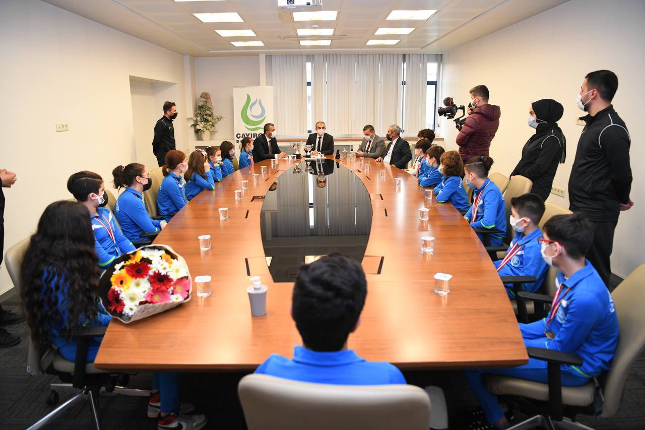 Çayırova Belediye Başkanı Bünyamin Çifçi’nin göreve geldiğinde aktif hale getirip branş sayısını artırdığı Çayırova Belediyesi Eğitim Spor Kulübü, müsabakalarda başarılı sonuçlar elde etmeye devam ediyor. Başkan Çiftçi, Gebze ve Nevşehir’de düzenlenen yarışmalarda dereceye giren yüzme branşı sporcularını kabul etti. Başkan Çiftçi, ÇESK Başkanı Hasan Alkan, Spor İşleri Müdürü Muhammed Nizamoğlu, eğitimciler ve sporcuların katıldığı ziyarette başarılarından dolayı sporcuları tebrik edip hediyeler verdi.