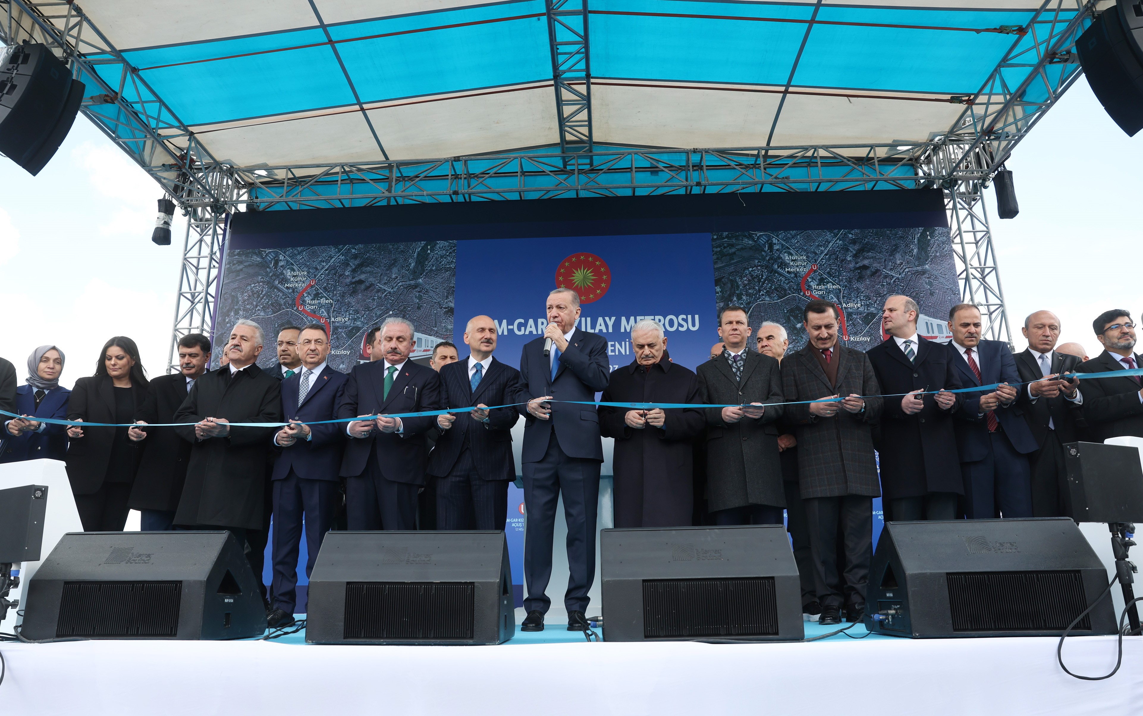 Cumhurbaşkanı Recep Tayyip Erdoğan, Ankara'da AKM-Gar-Kızılay Metrosu'nun açılış töreninde konuştu. Depremin yaralarını en kısa sürede sararak tüm şehirleri afetlere dirençli hale getirmekte kararlı olduklarına vurgu yapan Cumhurbaşkanı Erdoğan, bu hazırlığı yaparken insanların hayatlarını kolaylaştırmaya, çocuklara güvenli, huzurlu, müreffeh bir gelecek hazırlamaya devam ettiklerini söyledi. Erdoğan, ”Şehirlerimizi altyapısı ve üst yapısıyla geliştirmeye yönelik projeleri adım adım hayata geçiriyoruz. Bugün de başkentimiz Ankara'nın şehir içi ulaşımı için kritik bir projenin açılışını yapmak üzere bir aradayız. AKM-Gar-Kızılay Metro hattı Ankara'nın farklı ulaşım ağlarını birbirine bağlayan bu özelliğiyle de 3,3 kilometre uzunluğunun ve 3 istasyonunun ötesinde bir öneme sahiptir. Bu metro, bu muhteşem Gar istasyonu üzerinden YHT'ye, Başkentray'a ve Ankaray'a aktarma yapılabilecek. Adliye istasyonundan yine Başkentray'a geçilebilecek. Kızılay istasyonu üzerinden ise Batıkent, Çayyolu ve Ankaray metrolarına erişilebilecek. Bu hattın ülkemize karayolu, vakit, çevre gibi başlıklarda yapacağı katkıların yıllık değeri 9 milyar lirayı bulacak” açıklamasını yaptı.