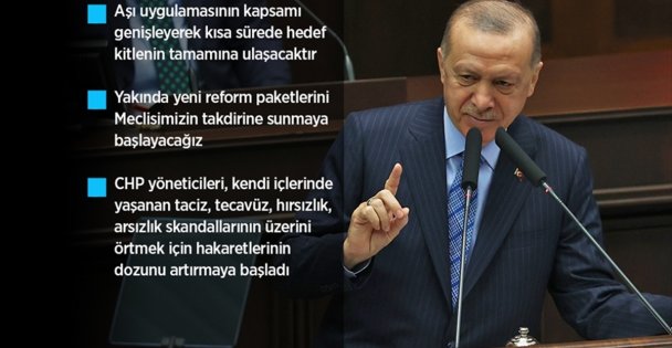 "Hiç şüphesiz bizim asıl gündemimiz, ülkemizin ve milletimizin meseleleridir. Salgınla mücadelemizde aşı çalışmalarına başlanması ile yeni bir safhaya geçtik. Sağlık Bakanlığımızın belirlediği programa göre aşı tedarikini, dağıtımını ve uygulamasını sürdürüyoruz. İşte şu an itibarıyla 10 milyon doz aşıyı ülkemize getirttik. Dünyada geliştiğini söyleyen ülkeler aşı bulamıyor ama biz hamdolsun yaptığımız anlaşmayla bu 50 milyon dozun 10 milyonunu tedarik etmiş vaziyetteyiz. Aşı uygulamasının kapsamı giderek genişleyerek inşallah en kısa sürede hedef kitlenin tamamına ulaşacaktır. Tedbirlerden etkilenen kesimlere yönelik destek programlarımızı ihtiyaca göre hem genişletiyor hem de sürelerini uzatıyoruz. Esnaflarımızı bugüne kadar yalnız bırakmadık, bundan sonra da yalnız bırakmayacağız."