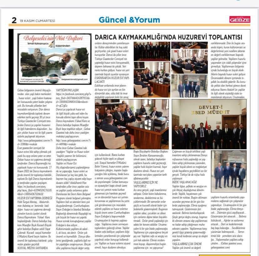 Darıca’ya yapılacak huzur evi ile ilgili büyük çaba sarf eden bu konuda ellerini taşın altına koyan Darıca kaymakamı Yüksel Kara ve Darıca belediye başkanı Muzaffer Bıyık beye teşekkür ediyor , Gebze Gazetesi’nde daha önce yazdığım makaleyi paylaşıyorum.