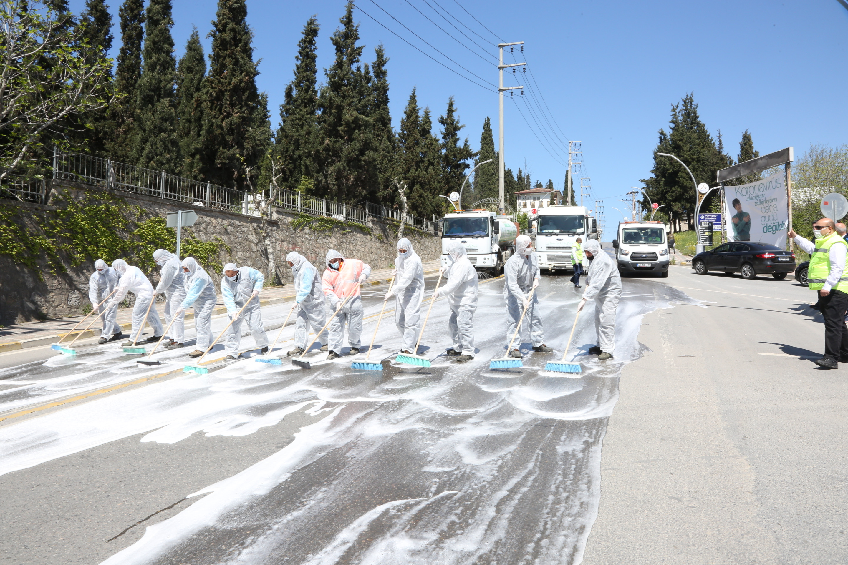 Darıca Belediyesi, koronavirüs salgınını önleme çalışmaları kapsamında çalışmalarına ara vermeden devam ederken sokağa çıkma yasağı nedeniyle boş kalan cadde ve sokakları hafta sonu iki gün boyunca dezenfektanlı suyla baştan sona yıkadı. Temizlik İşleri Müdürlüğüne bağlı ekipler, bir yandan yıkama araçlarıyla caddeleri köpüklü suyla yıkarken ellerine fırça alan ekipler de sokakları fırçalayarak temizledi.