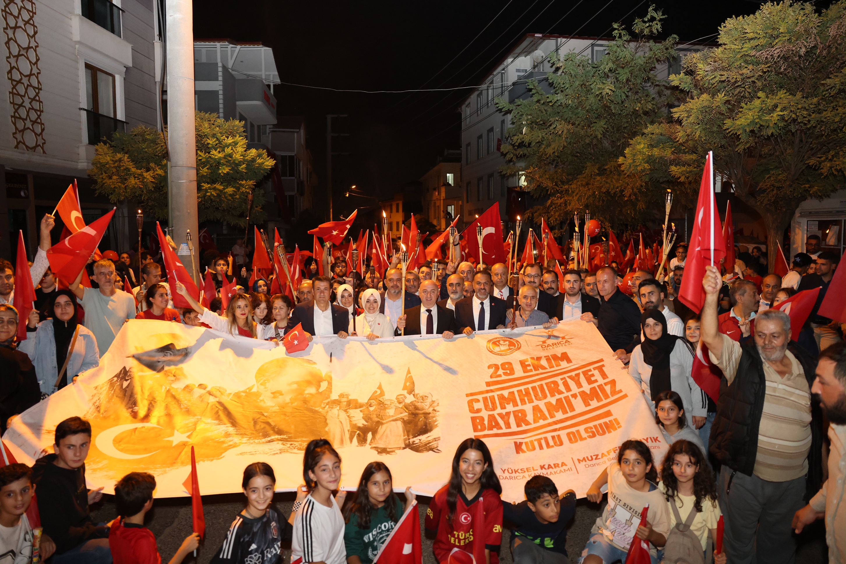 Bir hafta boyunca çeşitli etkinliklerin düzenlendiği Darıca’da cumartesi akşamı binlerce kişinin katılımıyla Fener Alayı gerçekleştirildi. Darıca Belediye Başkanı Muzaffer Bıyık ve Darıca Kaymakamı Yüksel Kara da ellerinde fenerlerle Darıcalılarla birlikte yürüdü. MT binicilik kulübü de atlı yürüyüş ile Fener Alayına renk katarken binlerce Darıcalı Bağlarbaşı Ortaokulu’ndan Çınaraltı Meydanı’na kadar sloganlar eşliğinde yürüyüş gerçekleştirdi. Çınarlatı’nda sona eren yürüyüş sonrası Darıca Belediye Başkanı Muzaffer Bıyık, yürüyüşe katılan Darıcalılara teşekkür etti. Cumhuriyete sonsuza kadar sahip çıkmak için el ele canla başla çalışacaklarını söyleyen Başkan Muzaffer Bıyık, 29 Ekim Cumhuriyet Bayramı’nın 100. Yılı dolayısıyla coşkulu ve mutlu olduklarını söyledi.