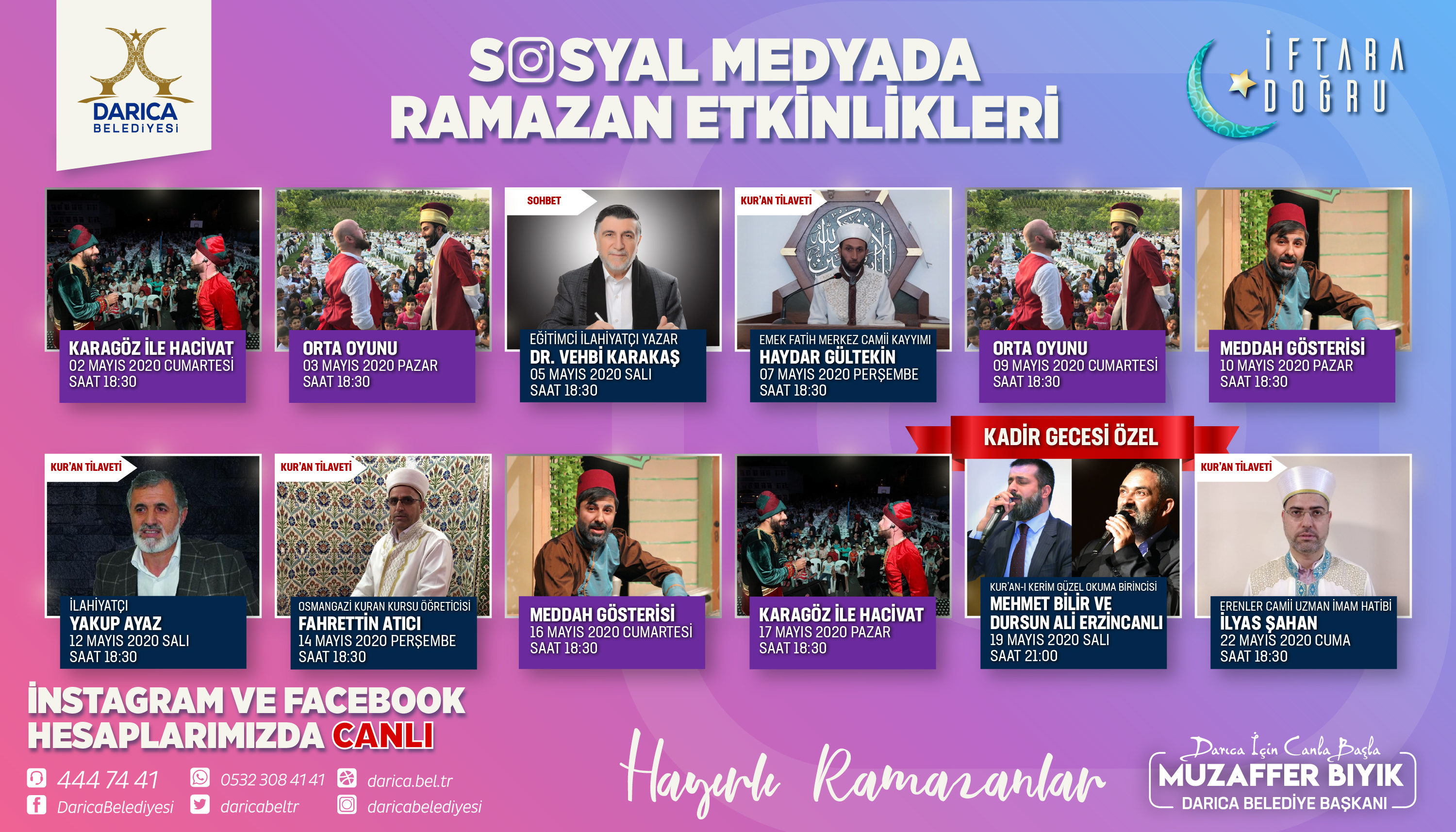 Koronavirüs tedbirleri kapsamında evde kalan Darıcalıların Ramazan coşkusunu evlerinde yaşamaları için adım atan ve 7’den 70’e herkes için program hazırlayan Darıca Belediyesi, geleneksel Ramazan eğlencelerinden olan orta oyunları ve Hacivat ile Karagöz gösterilerinin yanı sıra Kur’an tilaveti ve sohbet programlarıyla da Darıcalılara dolu dolu bir Ramazan yaşatacak. 2 Mayıs Cumartesi günü saat 18.30’da Hacivat ile Karagöz gösterisi ile başlayacak olan Sosyal Medyada Ramazan etkinlikleri, 3 Mayıs Pazar günü saat 18.30’da Orta Oyunu ile devam edecek ve bütün programlar sosyal medyadan canlı yayınlanacak.