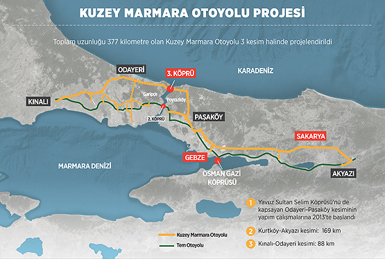 Kuzey Marmara Otoyolu için acil kamulaştırma kararı alındı. Gebze’yi de yakından ilgilendiren Kuzey Marmara Otoyolu (Yavuz Sultan Selim Köprüsü dahil) Projesi Kınalı-Odayeri ve Kurtköy-Akyazı kesimlerine yönelik olarak bazı taşınmazların Karayolları Genel Müdürlüğü tarafından acele kamulaştırılmasına ilişkin Bakanlar Kurulu kararı, Resmi Gazete'de yayımlandı. Karara göre; İstanbul Silivri, Çatalca, Arnavutköy, Eyüp, Sultangazi, Başakşehir, Pendik, Tuzla; Gebze, Dilovası, İzmit, Kandıra, Körfez, Derince; Adapazarı, Akyazı, Serdivan ilçelerindeki bazı taşınmazlar kamulaştırılacak.