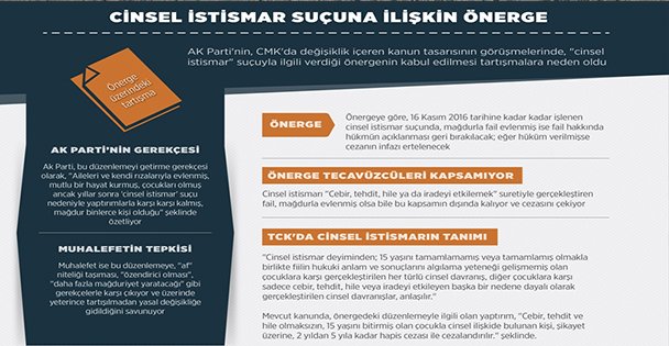 Cinsel istismar suçuna ilişkin önerge!AK Parti'nin, TBMM Genel Kurulunda görüşmeleri henüz tamamlanmayan, 18 Kasım 2016 Cuma 17:22 CMK'da değişiklik içeren kanun tasarının görüşmelerinde, "cinsel istismar" suçuyla ilgili verdiği önergenin kabul edilmesi tartışmalara neden oldu. Facebook'ta Paylaş Tweetle Google+ Paylaş