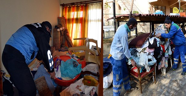 Belirtilen adrese giden ekipler, 72 yaşındaki M.İ. ile dokuz yıldır yatalak olan 53 yaşındaki kızı H.U'nun yaşadığı evde çöplerle karşılaştı. Evden 12 kamyon dolusu, 3 ton çöp çıkarıldı.