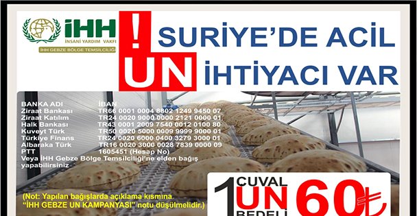 6 yıldır devam eden Suriye savaşında, mazlum halkın yanında yer alan İHH , insani yardım çalışmalarına ara vermeden devem ediyor. Fırınların, hastanelerin, hareket eden herşeyin vurulduğu bir coğrafyada aş olup, ekmek olup, Suriye halkına karşı tarihi misyonun yanında Gebzelilerin de olmasını isteyen İHH, Giyecek, gıda, Nakdi yardım başta olmak üzere her yardımı Suriye’ye ulaştırıyor. Cuma günü Gebze’den gıda yardımı dolu Tırlar gönderecek olan İHH, vatandaşların yardımda bulunabilmeleri için banka hesap numaraları için görsel yayınladı. Vatandaşlar bu hesap numaralarından yardımlarını ulaştırabilecekler.