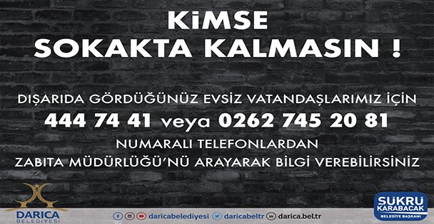 Darıca Belediyesi, sokaklarda kalan evsiz vatandaşların belirli süre konaklama ve diğer ihtiyaçlarının karşılanması için vatandaşlardan belediyeye bildirilmesini istedi. Önümüzdeki günlerde kar yağışıyla birlikte havaların iyice soğuması beklenirken, kalacak yeri olmayan vatandaşlar için bir telefon hattı oluşturan Darıca Belediyesi bu hatta gelen ihbarları değerlendirerek ilgili kişileri alıp belirli bir süre ilçedeki konaklama tesislerinde barındırmayı hedefliyor. Buralarda barınmaları sağlanacak vatandaşların yeme, içme, barınma, sağlık ve temizlik alanındaki tüm ihtiyaçları Darıca Belediyesi tarafından karşılanacak. Darıca Belediyesi yetkilileri konu ile ilgili olarak, vatandaşların 444 74 41 ve 0262 745 20 81 numaralı telefonları arayarak ilçedeki evsiz vatandaşları Darıca Belediyesi’ne bildirmelerini istediler.