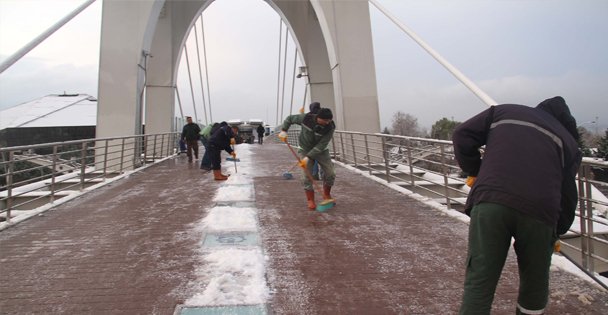 Kocaeli Büyükşehir Belediyesi Park Bahçe ve Yeşil Alanlar Dairesi Başkanlığı’na bağlı karla mücadele ekibi, Kocaeli’de bulunan yaya köprülerinin tamamında kar temizleme ve solüsyon çalışması gerçekleştirdi. Yapılan çalışmada köprülerin üzerinde bulunan kar temizlenirken, buzlanmaya karşı solüsyon döküldü.