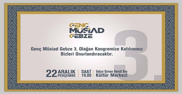 Genç MÜSİAD Gebze 22 Aralık Perşembe günü (yarın) kongreye gidiyor. Saat 19:00’da Osman Hamdi Bey Kültür Merkezi’nde yapılacak olan kongreye katılımın yoğun olması bekleniyor.