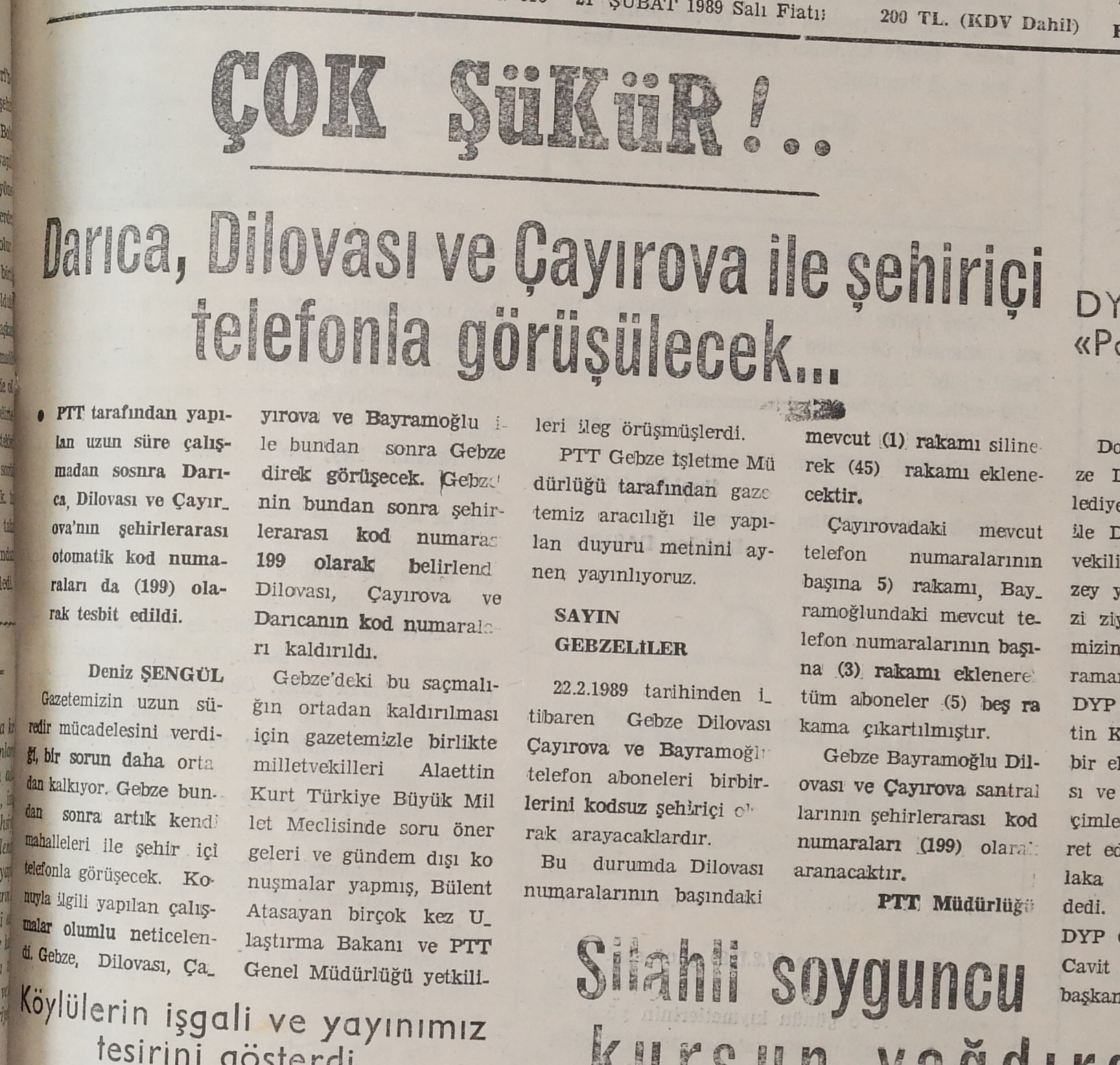 Gazete arşivimizden 21 Şubat 1989 Salı günü basılmış gazetemizin ana manşeti şu şekilde; ''ÇOK ŞÜKÜR Darıca, Dilovası ve Çayırova ile Şehir içi telefonla görüşülebilecek.''