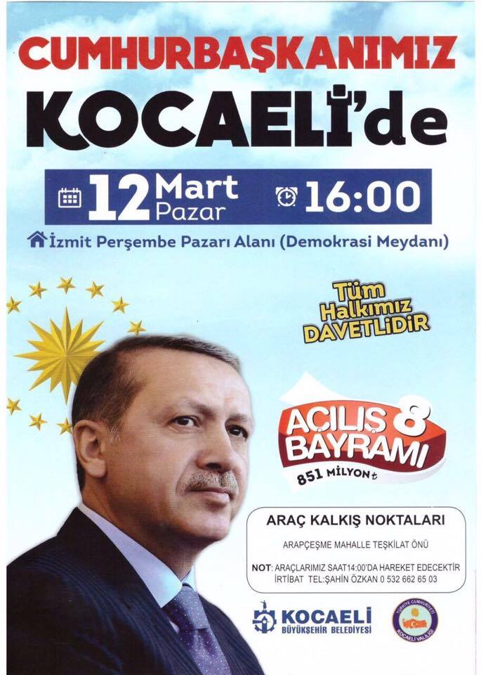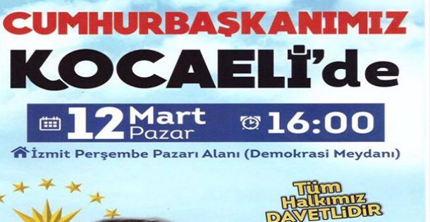 - Kocaeli'nde 851 milyon TL değerindeki 223 yatırımın açılışı, 12 Mart Pazar günü Cumhurbaşkanı Erdoğan tarafından gerçekleştirilecek