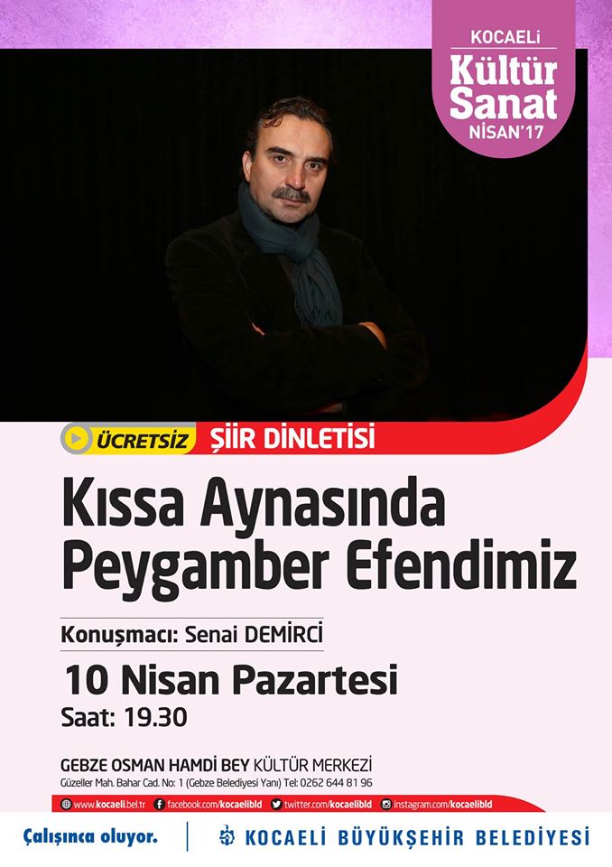 10 Nisan Pazartesi günü Osman Hamdi Bey Kültür Merkezinde ücretsiz şiir dinletisi sergilenecek. Kıssa Aynasından Peygamber Efendimiz konulu programa tüm Gebzeliler Davetli..
