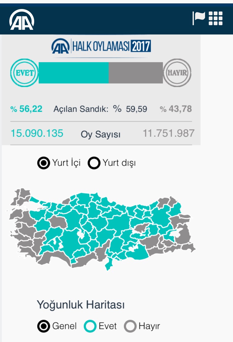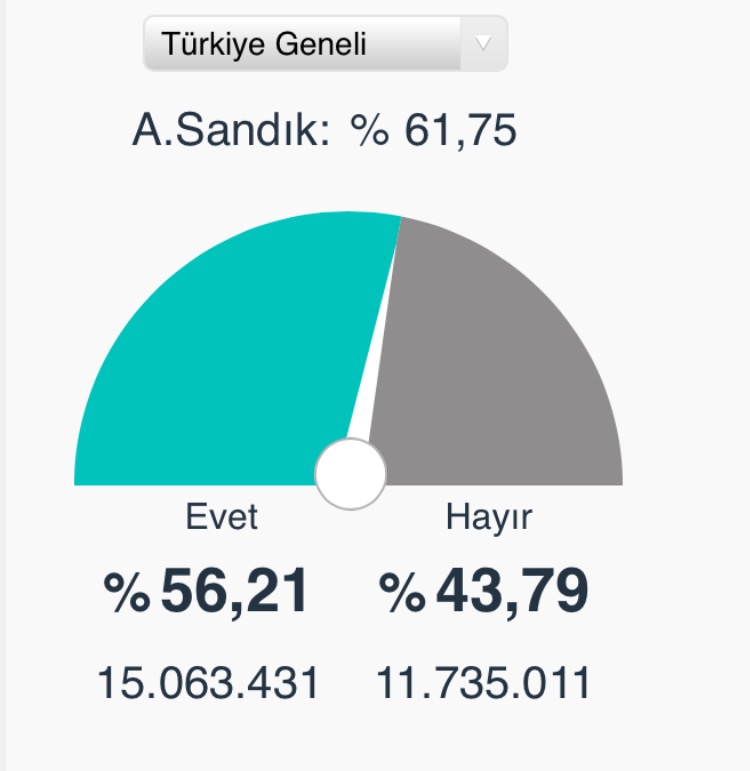 Açılan Sandık Oranı %59.59Sandıklar açılmaya devam ediyor. Anadolu ajansı verileri doğrultusunda bilgiler şu şekildedir. 16 Nisan 2017 Pazar 18:35 Facebook'ta Paylaş Tweetle Google+ Paylaş