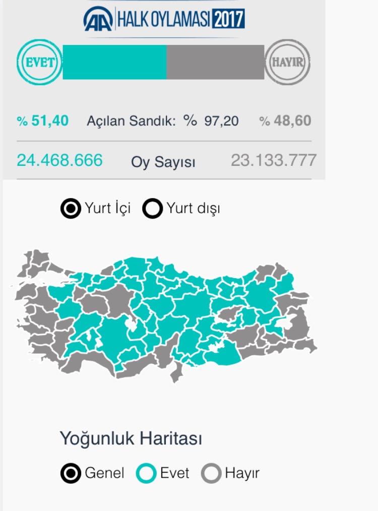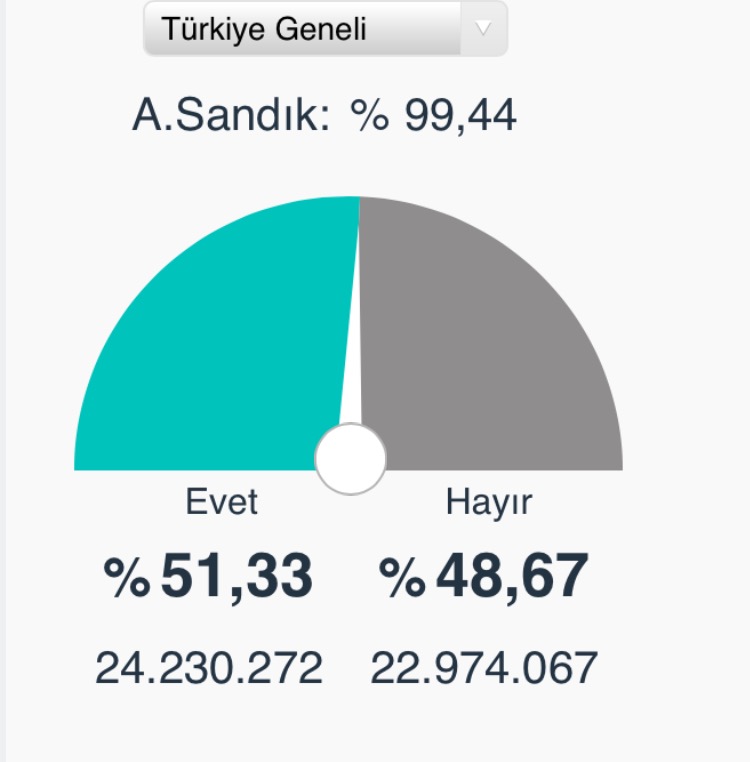 Açılan Sandık Oranı %99,46Anadolu ajansından alınan bilgiler doğrultusunda açılan Sandık Oranı %99,46 bilgiler şu şekilde 16 Nisan 2017 Pazar 20:11 Facebook'ta Paylaş Tweetle Google+ Paylaş