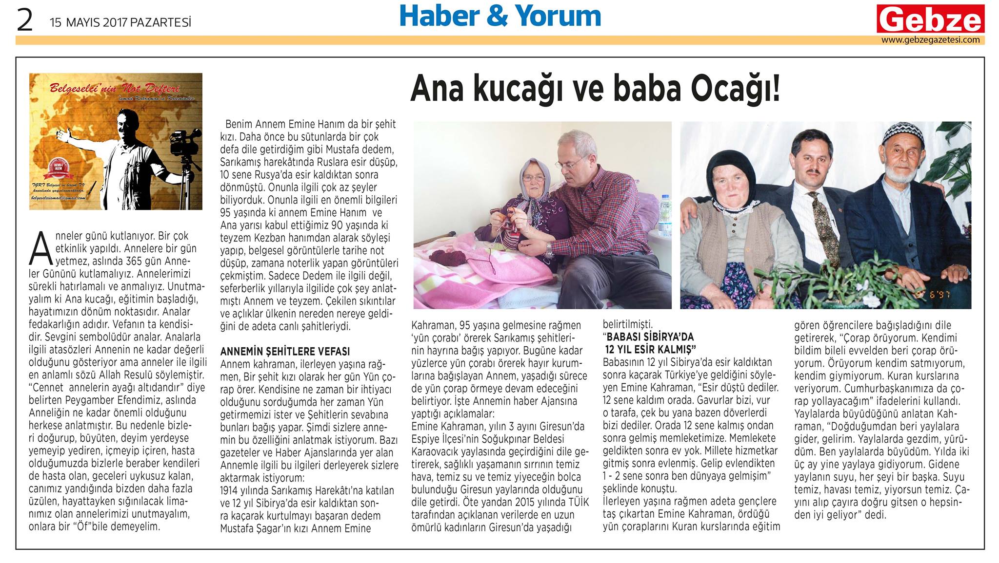 Benim Annem Emine Hanım da bir şehit kızı. Daha önce bu sütunlarda bir çok defa dile getirdiğim gibi Mustafa dedem, Sarıkamış harekâtında Ruslara esir düşüp, 10 sene Rusya’da esir kaldıktan sonra dönmüştü. Onunla ilgili çok az şeyler biliyorduk. Onunla ilgili en önemli bilgileri 95 yaşında ki annem Emine Hanım ve Ana yarısı kabul ettiğimiz 90 yaşında ki teyzem Kezban hanımdan alarak söyleşi yapıp, belgesel görüntülerle tarihe not düşüp, zamana noterlik yapan görüntüleri çekmiştim. Sadece Dedem ile ilgili değil, seferberlik yıllarıyla ilgilide çok şey anlatmıştı Annem ve teyzem. Çekilen sıkıntılar ve açlıklar ülkenin nereden nereye geldiğini de adeta canlı şahitleriydi.