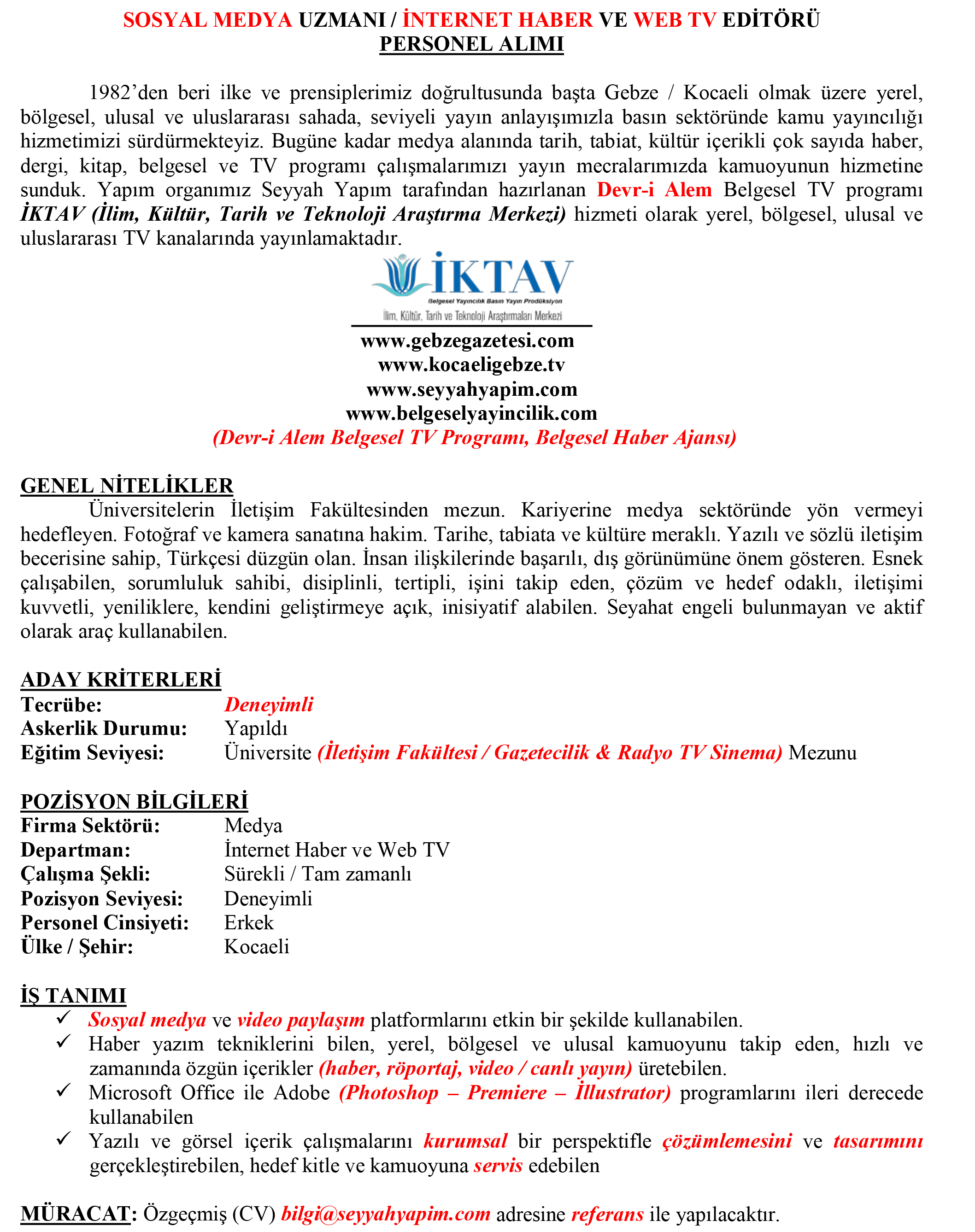 Sosyal Medya - Editör Personel AlımıSosyal Medya - İnternet Haber ve Web TV Editörü personel alımı. 24 Haziran 2017 Cumartesi 12:47 Facebook'ta Paylaş Tweetle Google+ Paylaş