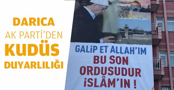 AK Parti Darıca İlçe Başkanı Muzaffer Bıyık, Kudüs’e destek olmak için Darıca’nın girişine 60 metrekarelik dev bir afiş astırdı. Kudüs’ün resminin olduğu afişte ayrıca Cumhurbaşkanı Erdoğan’ın dua ederken görüldüğü bir resim bulunuyor. Afişte ise “Galip et Allah’ım bu son ordusudur İslam’ın” yazısı yer alıyor. Afiş, Darıcalılar tarafından da beğeni topladı.