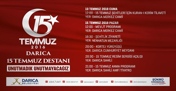 Darıca Belediye Başkanı Şükrü Karabacak, 15 Temmuz akşamı yapılacak olan etkinliklere tüm vatandaşları davet ederken “15 Temmuz 2016 tarihi ülkemiz açısından unutulmayacak bir dönüm noktasıdır. Devletimizin içine yerleşmiş Fetö Terör Örgütü üyelerinin ülkemizin birliğine ve beraberliğine kastettiği 15 Temmuz Darbe Girişimi, Cumhurbaşkanımız Sayın Recep Tayyip Erdoğan öncülüğünde halkımız tarafından bertaraf edilerek adeta yeniden bir kurtuluş destanı yazılmıştır. O zor günlerde ülkemizde demokrasinin millet tarafından ne kadar özümsendiğini, milletimizin seçilmiş iradenin arkasında nasıl durduğunu hep birlikte gördük. Darbe girişiminin ardından 27 gün süren demokrasi nöbetlerinde yediden yetmişe, siyasi parti ayrımı yapmaksızın halkımız sokaklarda darbeye ve darbecilere karşı net bir şekilde duruş sergilemiş ve demokrasiye olan inancımızı bütün dünyaya göstermiştir. Hepimizin ortak değeri ülkemizin gelişmesi ve refah seviyesini artırmak olmalıdır. Gelecek nesillere, çocuklarımıza yaşanabilir, özgür ve demokrasiyi özümsemiş bir devlet bırakmak hepimizin asli görevidir. Bu yüzden tek millet, tek devlet, tek vatan, tek bayrak diyoruz. Bir daha bu tür hain darbe girişimlerinin yaşanmaması ve şehitlerimizin ebediyete kadar isimlerinin yaşatılarak, kahramanlıklarının gelecek nesillere aktarılması için “15 Temmuz Demokrasi ve Milli Birlik Günü” olarak kabul edilen günde halkımızla birlikte değişik etkinlikler düzenleyecek ve sabaha kadar nöbette olacağız. Tüm halkımızı düzenleyeceğimiz etkinliklerimize bekliyoruz.” dedi.