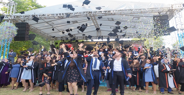 Daha sonra mezuniyet yemini eden öğrenciler, keplerini havaya atarak mezun olmanın sevincini yaşadı.