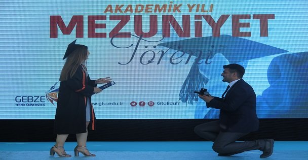 Törende sahneye çıkan geçen yıl Malzeme Bilimi bölümünden mezun olan Fatih Zeybek (25), Moleküler bölümü mezunu kız arkadaşı Hikmet Veli'ye (23) evlenme teklifi etti.