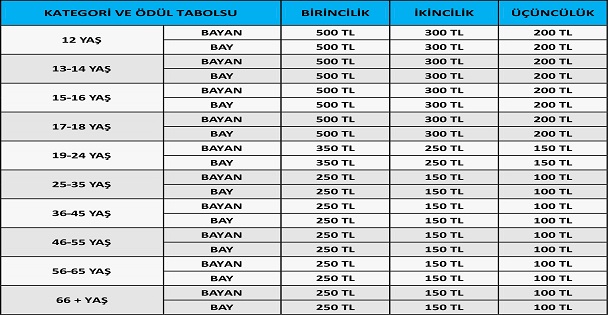 § Yarışmalarda yaş grupları ayrı ayrı değerlendirilecek olup ilk üç sporcuya madalya ve nakdi ödül verilecektir. § Yarışlara katılan tüm sporculara Katılım Belgesi, Tişört ve Bone verilecektir. Ayrıca katılımcılara su ve kumanya ikramı yapılacaktır.