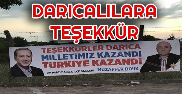 AK Parti Darıca İlçe Başkanı Muzaffer Bıyık Darıca’nın tüm mahallelerini ‘Teşekkür’ afişleri ile donattı. Vatandaşların teveccühü ile 24 Haziran seçimlerinde alnının akıyla çıkan AK Parti yeni sistemde yeni oluşumları ile hızla çalışmaya devam ediyor. İlçe Başkanı Muzaffer Bıyık Darıca geneline astırdığı 45 afiş ile ilginç mesajlar verdi. ‘AHDİN AHDİMİZDİR’ mesajını Cumhurbaşkanına gönderen Muzaffer Bıyık ayrıca ‘TEŞEKKÜRLER DARICA - MİLLETİMİZ KAZANDI - TÜRKİYE KAZANDI’ afişini çoğunlukta astırarak vatandaşlara teşekkür etti. Bu davranışıyla partililerden alkış alan Muzaffer Bıyık, yeni sistemde daha çok çalışarak yerel seçimlere hazırlandıklarını ifade etti.