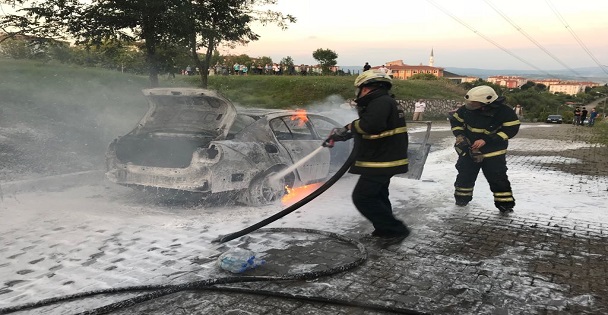 Alev alan otomobili söndürmekte güçlük çeken sürücü, olay yerine itfaiye ekiplerini çağırdı.