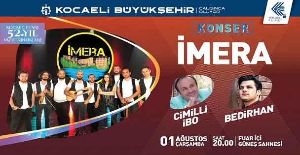 2014 yılında Ena isimli şarkıyla çıkış yakalayan Grup İmera’nın Merve Yavuz, Hüseyin Ulusan solistliğini yaparken, klasik ve akustik gitarda Yıldıray Yanlı, kemençede Berat Bayraktar, tulumda Cem Yazıcı, perküsyonda Barış Engin, klavyede Murat Sönmez yer alıyor. Sibelim isimli şarkısıyla bilinen Karadeniz müziğinin güçlü sesi Cimilli İbo ve Hadi Canım Sende isimli parçayla tanınan Bedirhan da Grup İmera ile birlikte Kocaeli Fuarı Güneş Sahnesinde konser verecek.