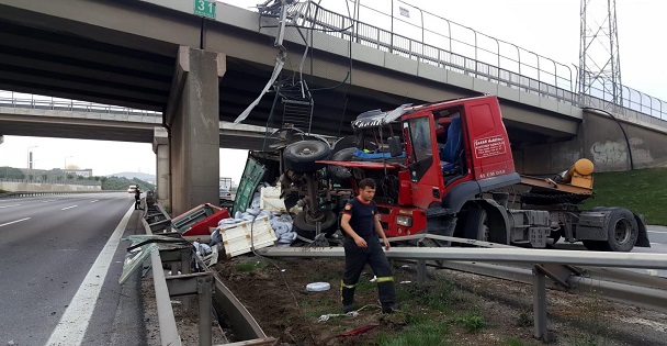 Alınan bilgiye göre, Şekerpınar Mahallesi Muhsin Yazıcıoğlu Caddesi'nde N.B'nin idaresindeki konteyner yüklü 41 UM 038 plakalı tır, kontrolden çıkarak önce bariyerlere çarptı, ardından köprüden Anadolu Otoyolu'na düştü. Son anda tırdan atlayarak yola düşen sürücü ağır yaralandı.