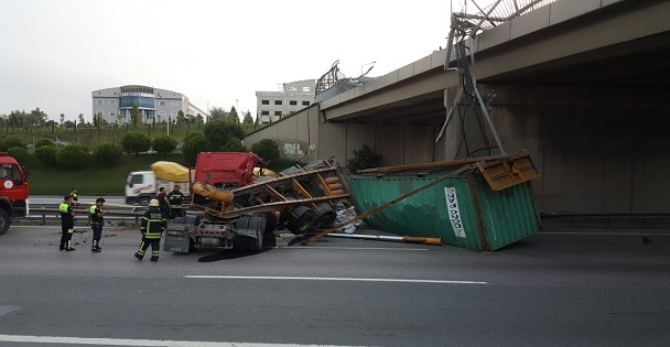 Çayırova'da konteyner yüklü tırın köprüden Anadolu Otoyolu'na düşmesi sonucu sürücü ağır yaralandı.