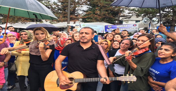 AHBAP platformu olarak direnişteki işçilerin okula giden 46 çocuğu için 300’er lira kırtasiye yardımı yaptıklarını duyuran sanatçı, burada şarkılar söyledi.
